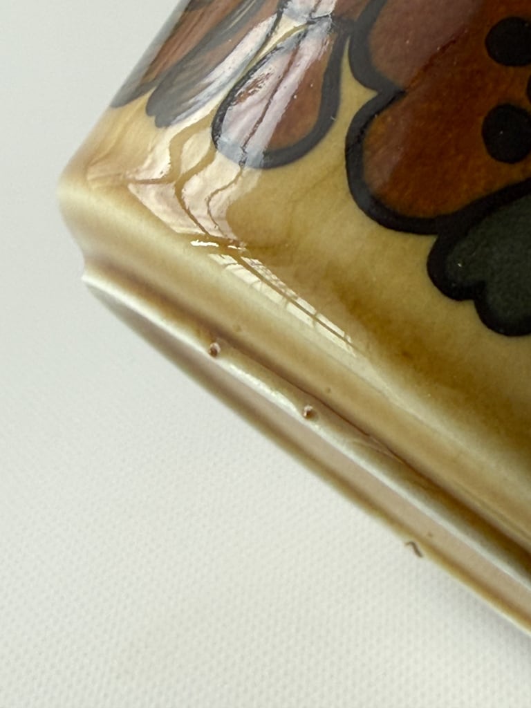 ボウルの底やフタの裏側に点となった釉薬のかたまりが見られます。高台にくぼみと製造時にできたと思われる突起がありますが、使用感をあまり感じず、ヒビ、チップ、気になるキズはなく、ツヤもあり、とてもきれいな状態です。