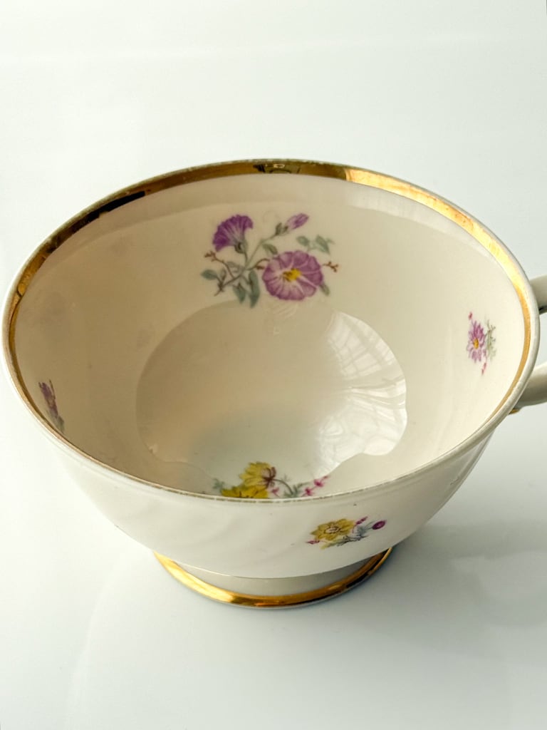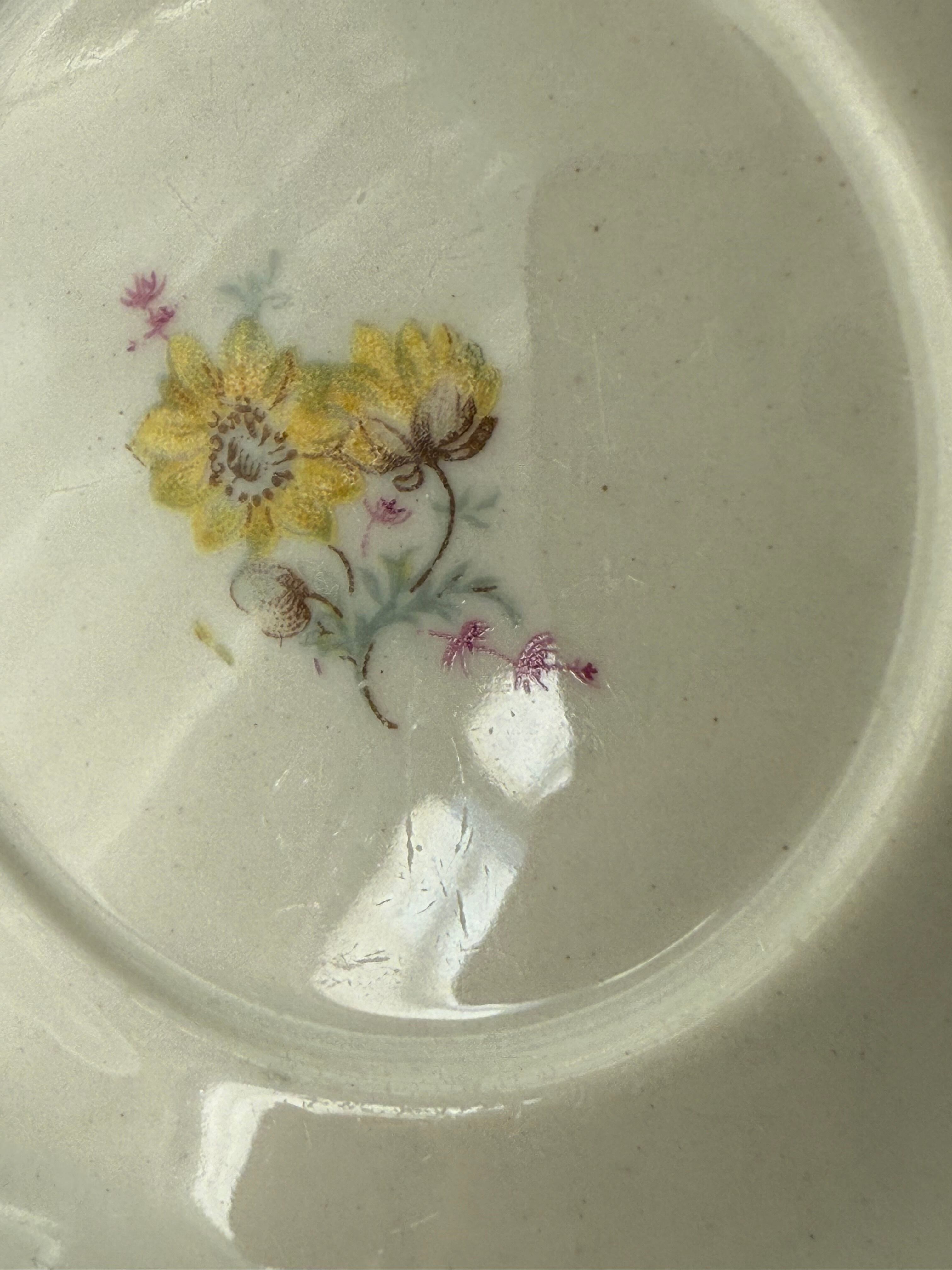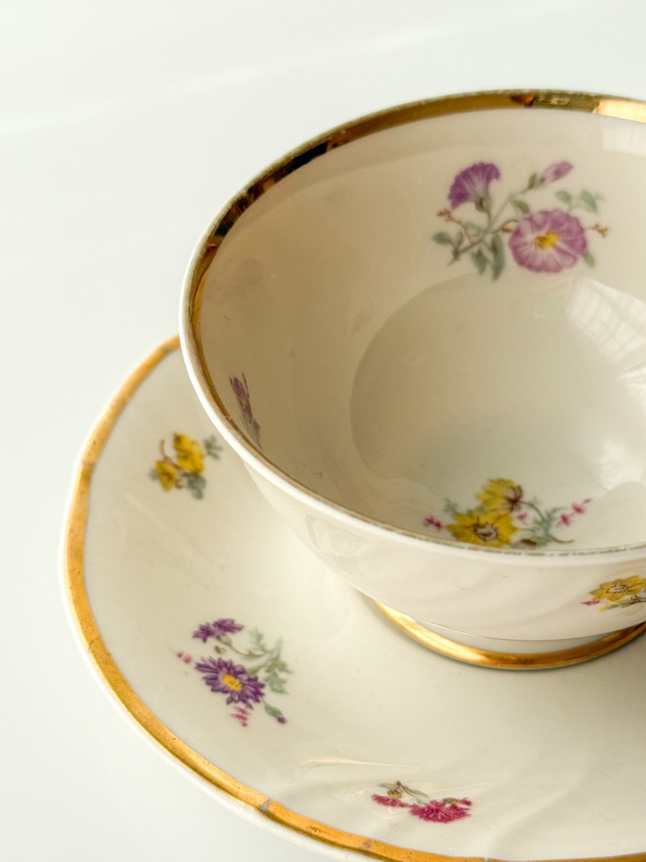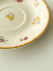 カップ、ソーサーともフチの金色部分全体にかすれが見られます。カップの高台底とソーサー表面の細かなキズ、裏側に削れがありますが、ツヤもあり全体的にきれいな状態です。
