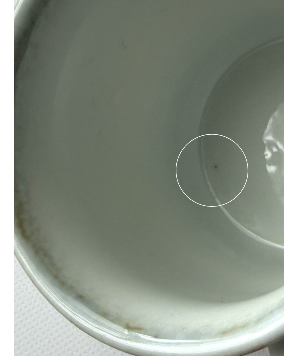 製造時にできたカップの内側の黒点、カップ縁の突起、カップの底に黒点、カップ表面に小さく丸い色抜けが2か所あります。ソーサーに小キズやスレがありますが、ヒビ、カケ、目立つようなキズはなく、きれいな状態です。製造時の色ムㇻがあります。